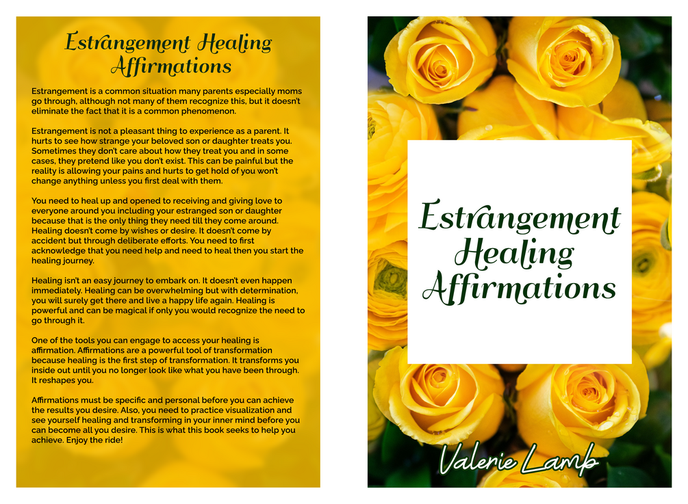 Estrangement Healing Affirmation is an E-book that many of Us who seek Healing from the Estrangement of our Sons, Daughters mainly, or even Loved ones who are Estranged from Us. You, Me, or anyone feeling or Experiencing this Horrible Pain. Reading this book will offer you Healing in so many ways.